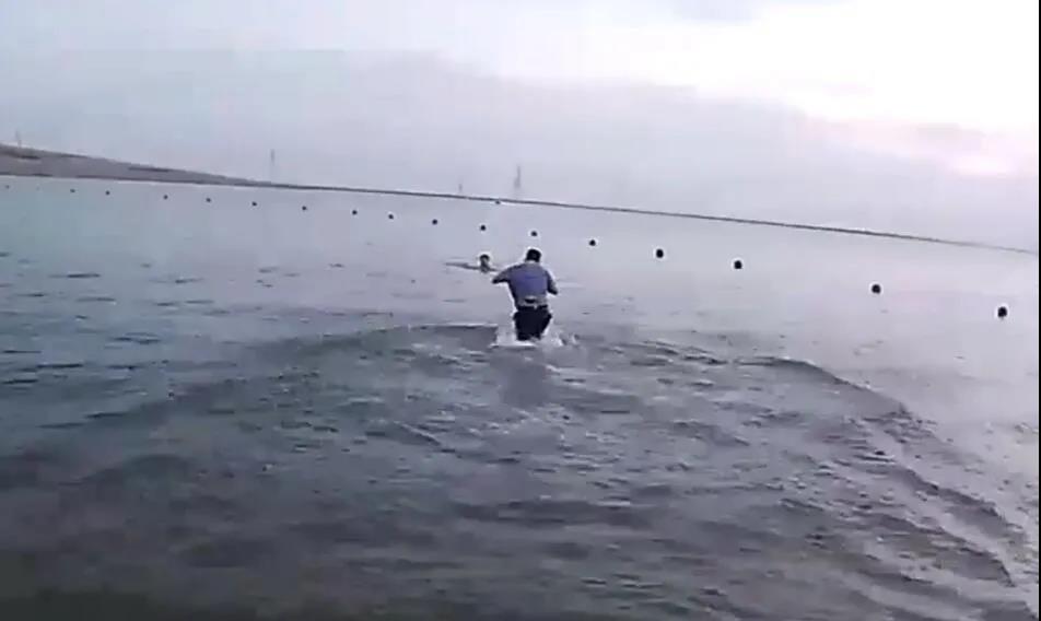 一男子在滄州渤海新區(qū)金沙灘景區(qū)玩水時,腿部突然抽筋,手不停地拍打水面。危急時刻,渤海新區(qū)公安分局輔警李浩吼出一串“別動”,沖進水中救人。