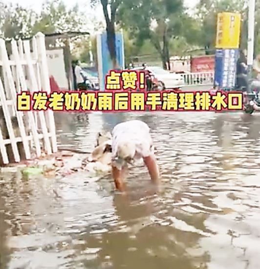 “暴雨導(dǎo)致滄州軍分區(qū)對(duì)面的一條胡同積水嚴(yán)重,為了讓積水更快退去,一位老人很早就起來(lái)用手清理排水口。老人不怕臟!不怕累!讓我們?yōu)樗c(diǎn)贊……”近日,這段僅有12秒的短視頻在網(wǎng)上熱傳,這位老人的舉動(dòng)感動(dòng)了很多市民。
