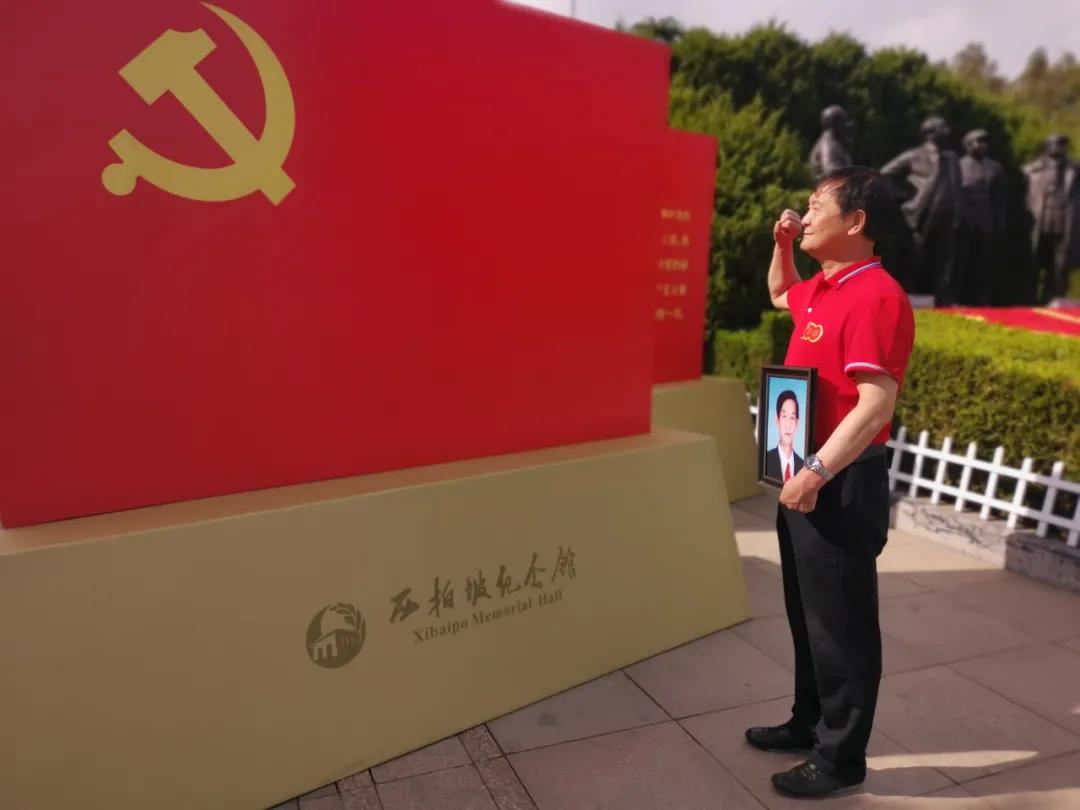 在中國共產(chǎn)黨七屆二中全會舊址前的黨旗下,馬涌華捧著父親的遺像,替父親重溫了一遍入黨誓詞。隨后,他又帶領(lǐng)同行的老黨員們,莊嚴地舉起了右拳。