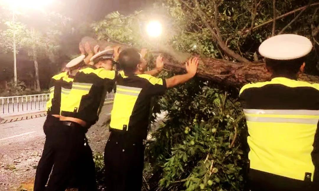 記者當晚冒雨采訪過程中發(fā)現(xiàn),市區(qū)街道上不時出現(xiàn)大樹被風刮倒阻礙交通的情況。而這時,一批批民警值守在街頭,哪里有需求,哪里就有他們的身影。