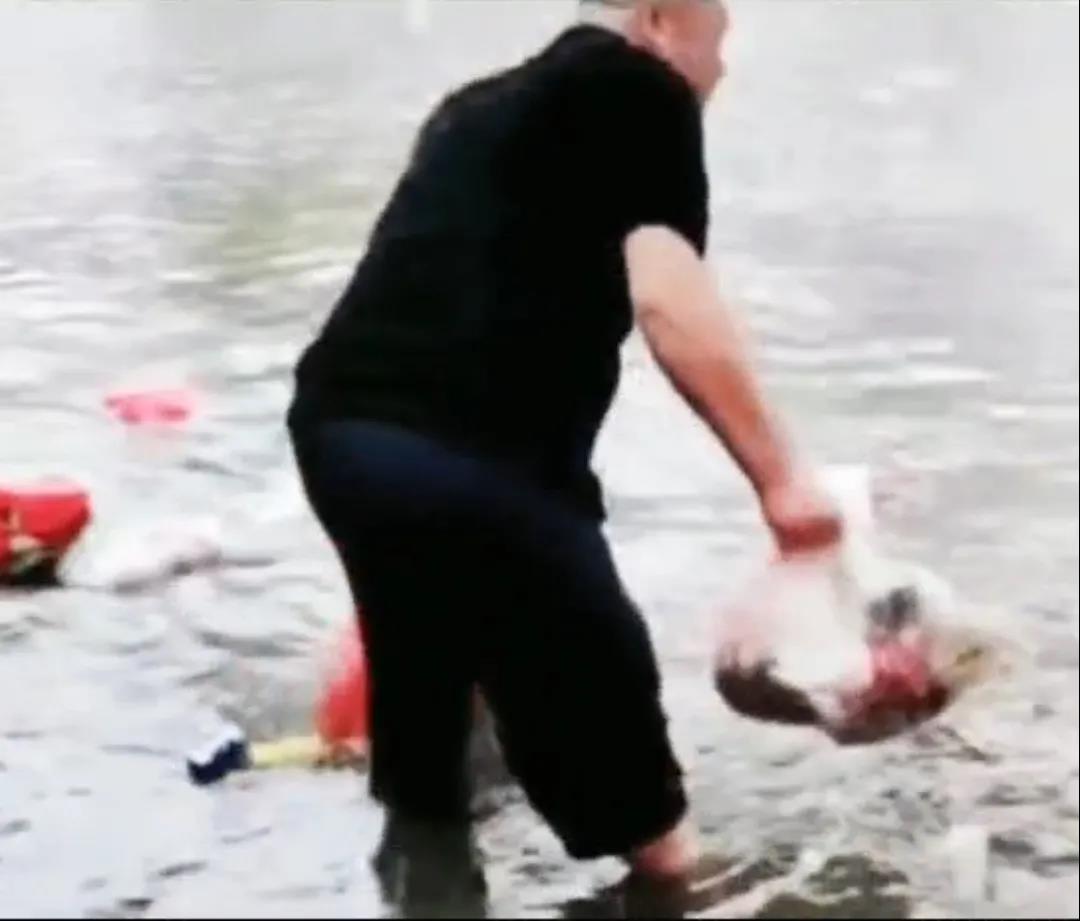 “我當時也沒想太多,就到水里把垃圾撿了起來。”陳忠政往返幾趟,蹚水將20多袋垃圾重新放回垃圾桶內。沒想到這一幕被附近門市的商戶拍下來發(fā)到了網(wǎng)上。