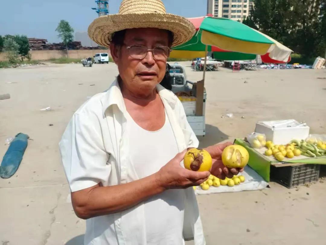 這些“爛梨”上都有一兩個(gè)口子。跟梨攤上的其他品相好的梨相比,“爛梨”并不是很好賣(mài)。