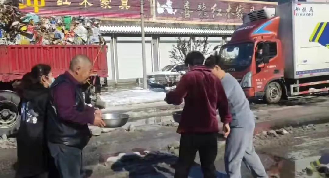 一位司機(jī)看到幾位村民端來熱騰騰的飯菜,便問道:“多少錢一份?”“不要錢,免費(fèi)的,快吃點(diǎn)暖和暖和吧?!表n慶芬說。幾個人端著大鋁盆在貨車間穿梭,為每位司機(jī)送去冒著熱氣的肉燴菜和饅頭。