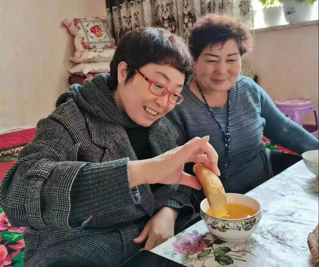 ▲張東玲(左)與當(dāng)?shù)毓鹿牙先送泻咸岷薄べ惗爬蠼憬Y(jié)成了幫扶對(duì)子,經(jīng)常來她家探望。