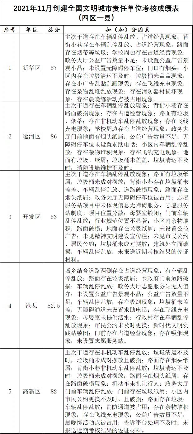 本次考核滿分為100分,內(nèi)容包括實(shí)地考察、網(wǎng)上資料申報(bào)、重點(diǎn)工作和信息反饋等;考核方式為實(shí)地點(diǎn)位抽查、包聯(lián)社區(qū)(村)和生活小區(qū)檢查、網(wǎng)上申報(bào)資料審閱、日常掌握重點(diǎn)工作完成情況和信息反饋情況,經(jīng)綜合打分,評(píng)定出各責(zé)任單位2021年11月考核成績(jī)(市直駐滄單位和四區(qū)一縣分別排名),并對(duì)各單位創(chuàng)建弱項(xiàng)、短板和影響考核成績(jī)的項(xiàng)目進(jìn)行了梳理提示。此次考核進(jìn)步最快的三個(gè)單位分別為:市退役軍人事務(wù)局、中行滄州分行、團(tuán)市委;退步最大的三個(gè)單位分別為:郵儲(chǔ)銀行滄州市分行、滄州農(nóng)商行、大運(yùn)河辦?,F(xiàn)將考核成績(jī)予以公示,如有異議,請(qǐng)將書面復(fù)議材料經(jīng)單位主要負(fù)責(zé)同志簽字后,掃描電子版,于11月30日18:00前發(fā)創(chuàng)城辦郵箱czsccb@163.com,經(jīng)市創(chuàng)城辦審核認(rèn)定后的結(jié)果將作為11月考核最終成績(jī)報(bào)創(chuàng)建文明城市工作指揮部各領(lǐng)導(dǎo),下發(fā)各責(zé)任單位并在《滄州日?qǐng)?bào)》公布。