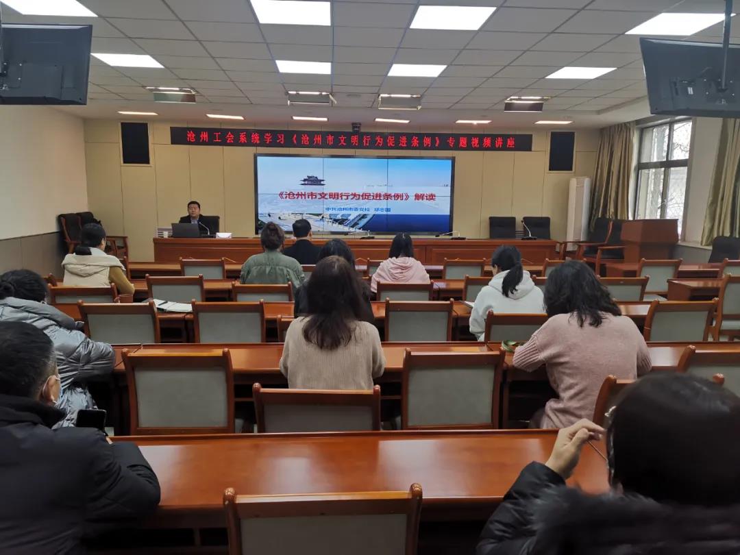 12月9日,市總工會(huì)組織舉辦全市工會(huì)系統(tǒng)學(xué)習(xí)《滄州市文明行為促進(jìn)條例》專題視頻講座。市總工會(huì)機(jī)關(guān)全體干部、市總工會(huì)對(duì)口單位工會(huì)負(fù)責(zé)創(chuàng)城工作的負(fù)責(zé)人,以及各縣(市、區(qū))總工會(huì)機(jī)關(guān)干部和對(duì)口單位工會(huì)負(fù)責(zé)創(chuàng)城工作的有關(guān)負(fù)責(zé)人聆聽(tīng)視頻講座。