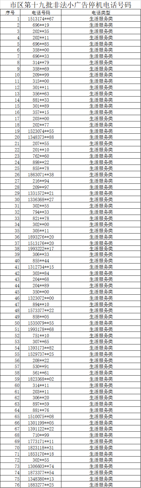 推進(jìn)非法小廣告常態(tài)化治理,我市持續(xù)發(fā)力。今天,市區(qū)第十九批共76部電話號碼被強(qiáng)制停機(jī)。截至目前,被停機(jī)的非法小廣告電話號碼達(dá)到1451部。其中,對生活服務(wù)類非法小廣告電話號碼實(shí)行臨時停機(jī)處理,待機(jī)主接受相應(yīng)的行政處罰后,由相關(guān)責(zé)任單位進(jìn)行復(fù)機(jī)。對涉嫌制販假證、假票據(jù)、涉黃涉黑等非法小廣告,由公安機(jī)關(guān)調(diào)查確認(rèn),進(jìn)行永久停機(jī)處理。