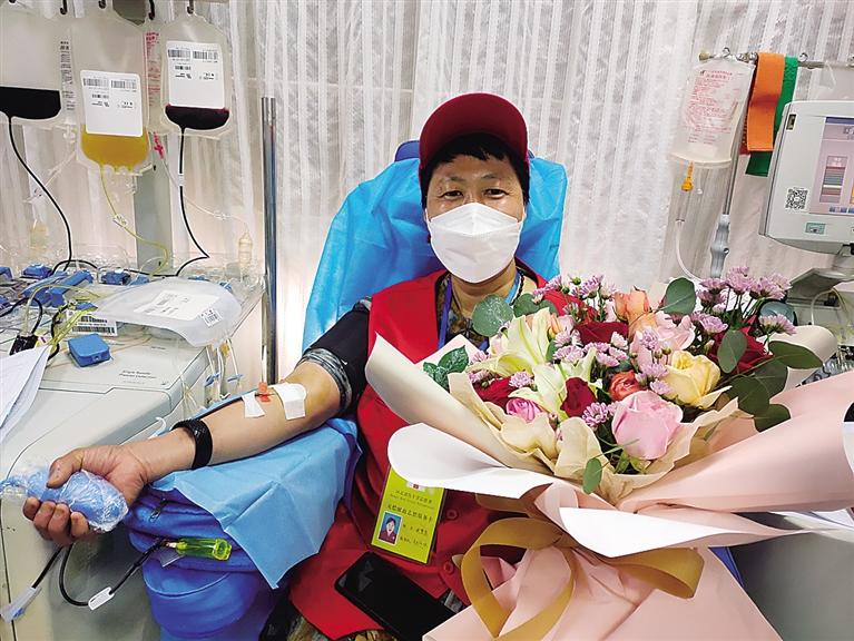 ▲張榮華完成自己的第100次獻(xiàn)血,工作人員為她獻(xiàn)上鮮花。
