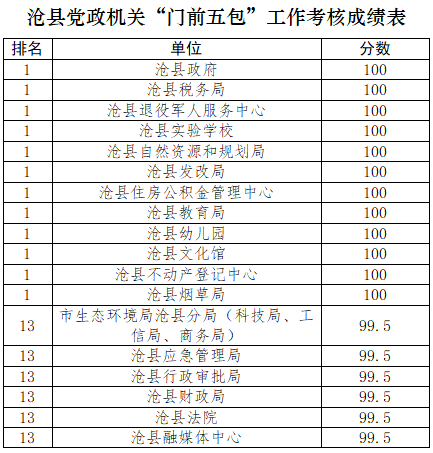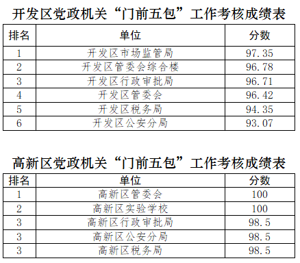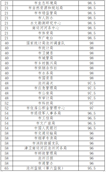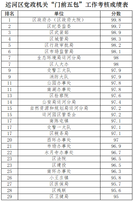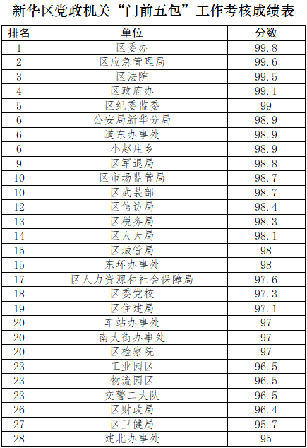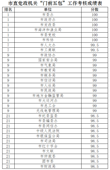 為優(yōu)化街面環(huán)境秩序,營造潔凈、優(yōu)美的城市環(huán)境,市創(chuàng)城辦以及滄縣、運(yùn)河區(qū)、新華區(qū)創(chuàng)城辦,開發(fā)區(qū)、高新區(qū)黨政辦分別對75個(gè)市直(駐滄)黨政機(jī)關(guān)單位及四區(qū)一縣106個(gè)黨政機(jī)關(guān)單位“門前五包”責(zé)任落實(shí)情況進(jìn)行了考核,現(xiàn)將考核情況予以公布。