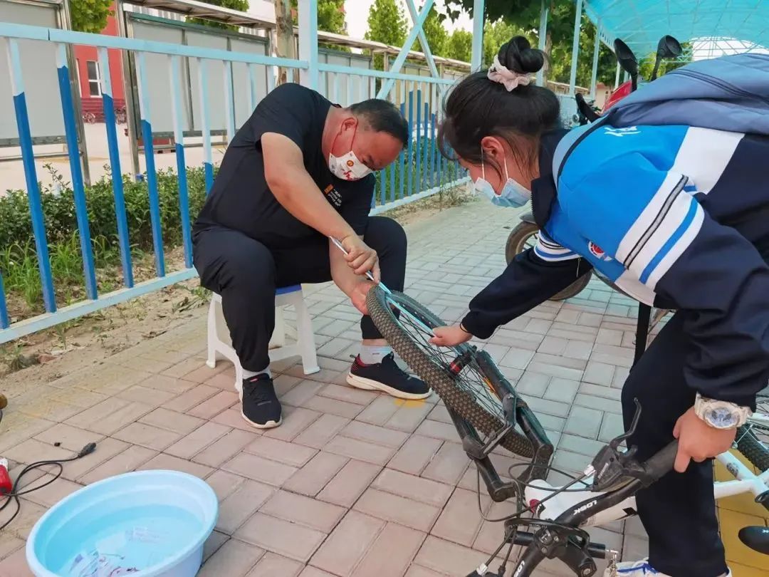 任丘市第六中學(xué)位于任丘市西環(huán)路街道長洋淀村西,2000多名學(xué)生,每天有幾百名師生騎車來學(xué)校,周邊3公里都沒有修理自行車的攤點(diǎn),看到因?yàn)樵o助的學(xué)生,學(xué)校教師、有26年黨齡的老黨員陳開通心中便萌生了這樣一個(gè)想法——在學(xué)校的保安室旁自費(fèi)購置補(bǔ)胎電動(dòng)工具和補(bǔ)胎膠片、膠水等創(chuàng)辦了一個(gè)愛心免費(fèi)修車鋪,讓學(xué)生和家長們多了一份安心。