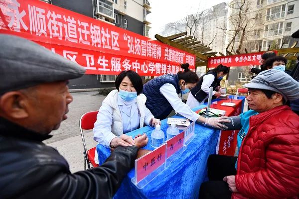 在河北省遷安市永順街道遷鋼社區(qū),志愿者為居民提供義診服務。圖片來源:遷安市文明辦