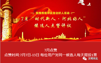 從7月7日起,7月“時(shí)代新人·河北好人”候選人點(diǎn)贊評(píng)議網(wǎng)絡(luò)互動(dòng)活動(dòng)啟動(dòng),歡迎廣大網(wǎng)友為月度“河北好人”候選人點(diǎn)贊并留言。其中,滄州候選人為:敬業(yè)奉獻(xiàn):張靜,見(jiàn)義勇為:張清江、張?zhí)炻?、張文韓,助人為樂(lè):賈蘭芝,孝老愛(ài)親:郭福芹。