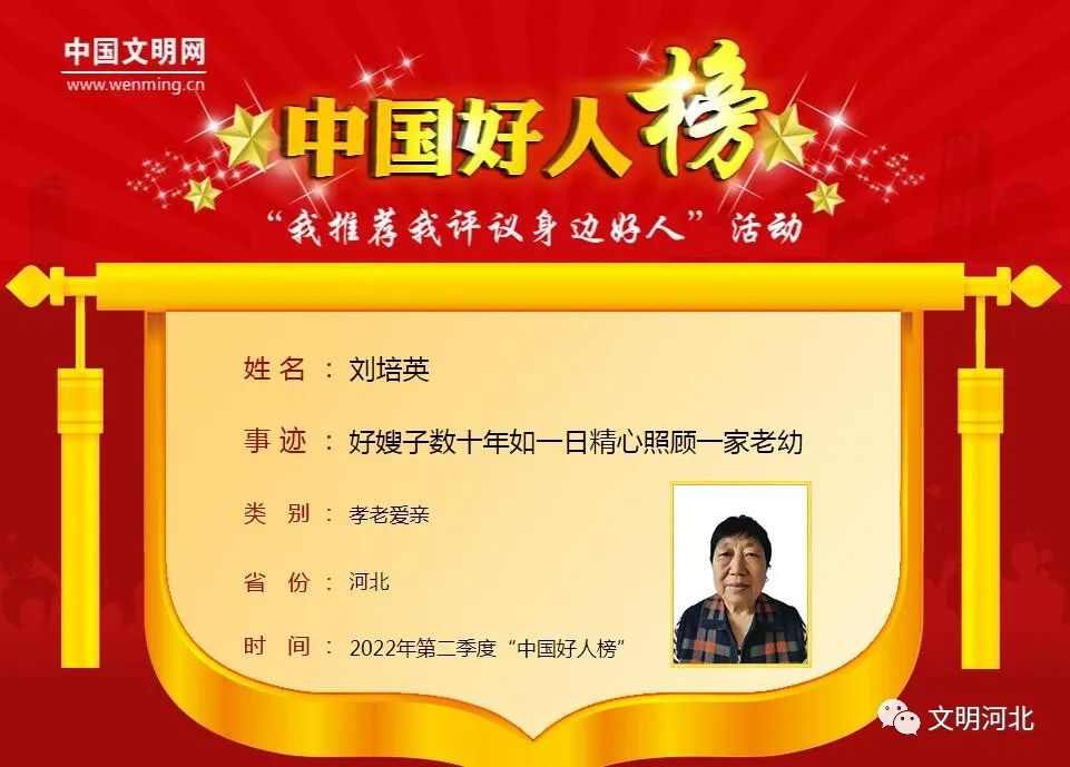 2022年第二季度“中國(guó)好人榜”8月5日上午在山東省曲阜市現(xiàn)場(chǎng)發(fā)布。河北省共有8人上榜。其中,我市劉培英榜上有名!截至目前,我市共有193人榮登“中國(guó)好人榜”。
