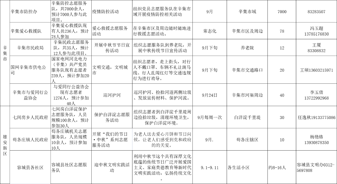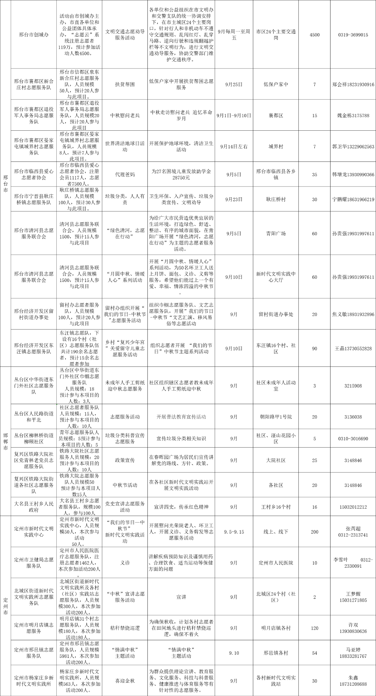中秋節(jié)、教師節(jié)期間,張家口、唐山、廊坊、滄州、邢臺、辛集、雄安新區(qū)等地開展“濃情九月、情系社區(qū)”“溫馨中秋節(jié),志愿一家親”“人月兩團(tuán)圓”等志愿服務(wù)項(xiàng)目,廣泛組織動員愛心團(tuán)隊(duì)和志愿者以退伍老兵、教師、文明家庭、困難學(xué)生為服務(wù)對象,開展關(guān)心關(guān)愛志愿服務(wù)活動。