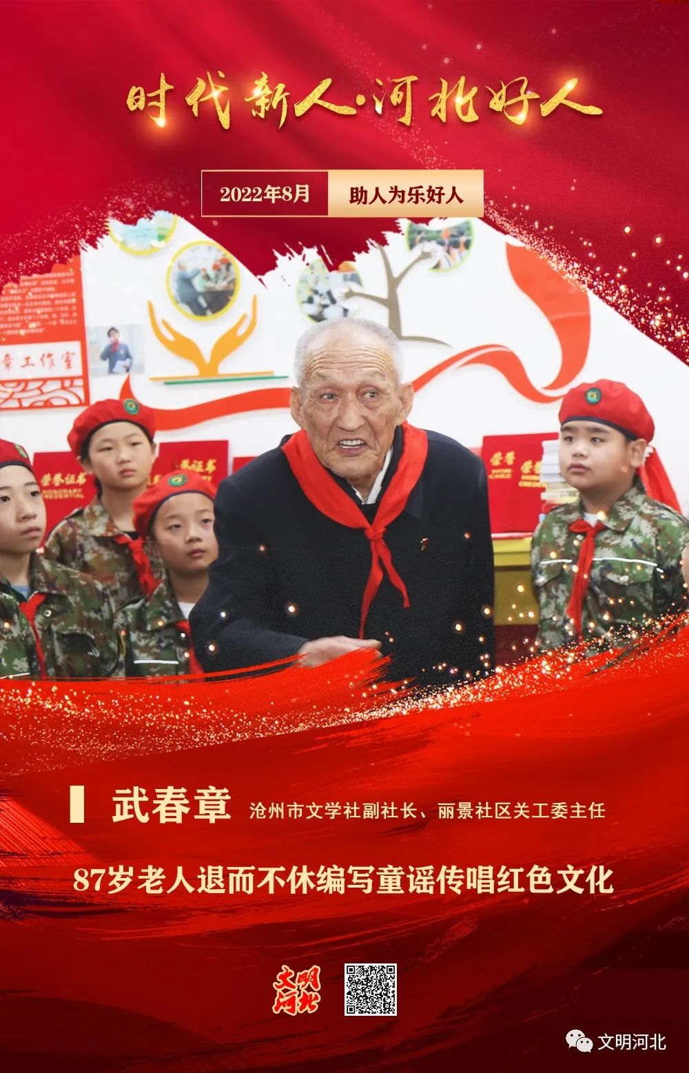 武春章,男,1935年出生,滄州市文學(xué)社副社長(zhǎng)、麗景社區(qū)關(guān)工委主任。武春章屹立三尺講臺(tái)42年,為鄉(xiāng)村教育事業(yè)鞠躬盡瘁。他退休后27載創(chuàng)作了1500多首宣傳社會(huì)主義核心價(jià)值觀的童謠,出版了9部童謠作品集;他走進(jìn)社區(qū)、走進(jìn)學(xué)校、走進(jìn)單位,甚至到監(jiān)獄給服刑人員宣講黨史、講社會(huì)主義核心價(jià)值觀、講奮斗精神;他同麗景社區(qū)精心設(shè)計(jì)并開辦了黨史教育館、社會(huì)主義核心價(jià)值觀教育展館和武春章工作室,培養(yǎng)青少年愛(ài)國(guó)愛(ài)黨情懷,義務(wù)為家長(zhǎng)宣講教育學(xué)問(wèn)。