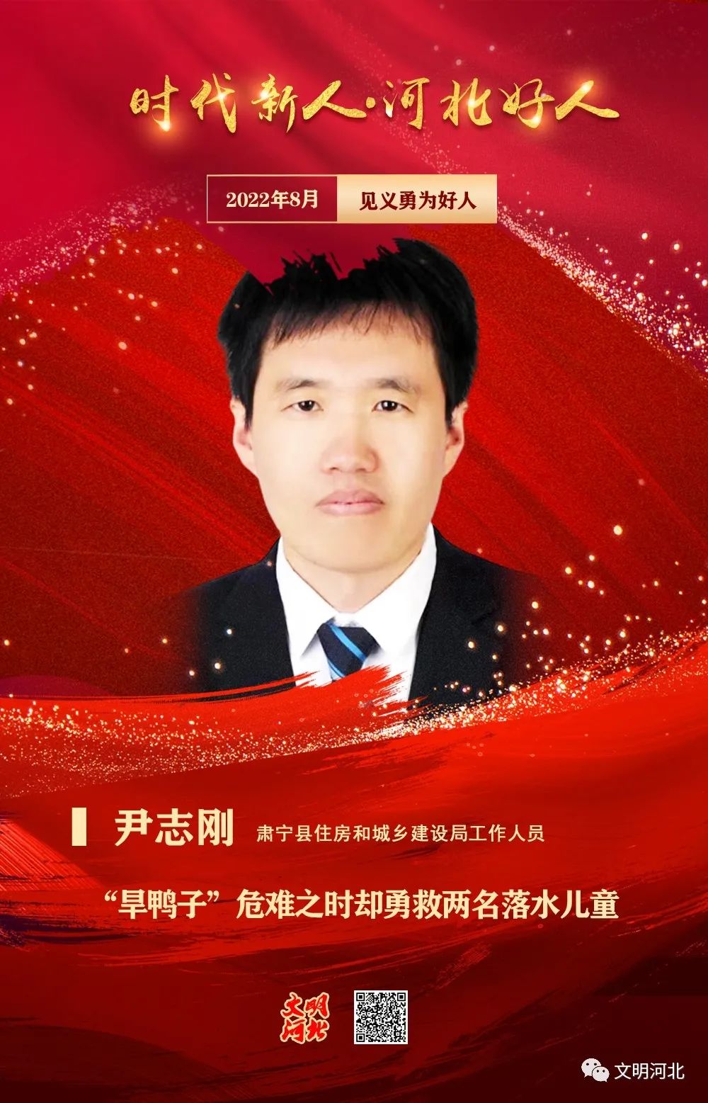 尹志剛,男,1984年出生,肅寧縣住房和城鄉(xiāng)建設(shè)局工作人員。2022年4月16日,正值水庫(kù)泄水,水勢(shì)湍急,一名孩子失足落入水中,孩子的哥哥沖入水中營(yíng)救也面臨危險(xiǎn)。尹志剛發(fā)現(xiàn)后,在他不會(huì)水的情況下,毅然跳入河中救人,憑借平時(shí)積累的救援知識(shí)和技能,先后把兩個(gè)孩子推到岸邊,在朋友的幫助下成功把孩子救上岸。
