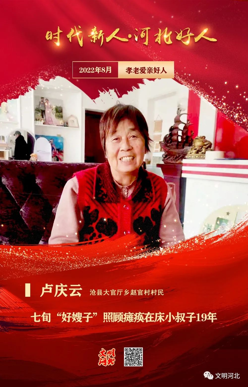 盧慶云,女,1951年出生,滄縣大官?gòu)d鄉(xiāng)趙官村村民。盧慶云有一個(gè)身患?xì)埣舶c瘓?jiān)诖驳男∈遄?,公婆去世前將小叔子托付他們夫妻,自那時(shí)起,他們就把照顧好小叔子作為自己的責(zé)任,日復(fù)一日?qǐng)?jiān)持19年,照顧小叔子飲食起居、看病就醫(yī)等日?,嵤?。盧慶云幾十年如一日,贍養(yǎng)公婆、照顧小叔子的故事在村里鄉(xiāng)里傳揚(yáng),受到人們稱贊,并深深地影響、教育了自己的子女,她的兒子也在積極組織參加志愿服務(wù),向社會(huì)奉獻(xiàn)愛(ài)心,不斷傳遞正能量。