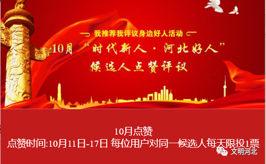 從10月11日起,10月“時代新人·河北好人”候選人點贊評議網絡互動活動啟動,歡迎廣大網友為月度“河北好人”候選人點贊并留言。其中,滄州候選人為:助人為樂:宋忠良;見義勇為:徐振海、趙國增;孝老愛親:卞淑英、張志強。