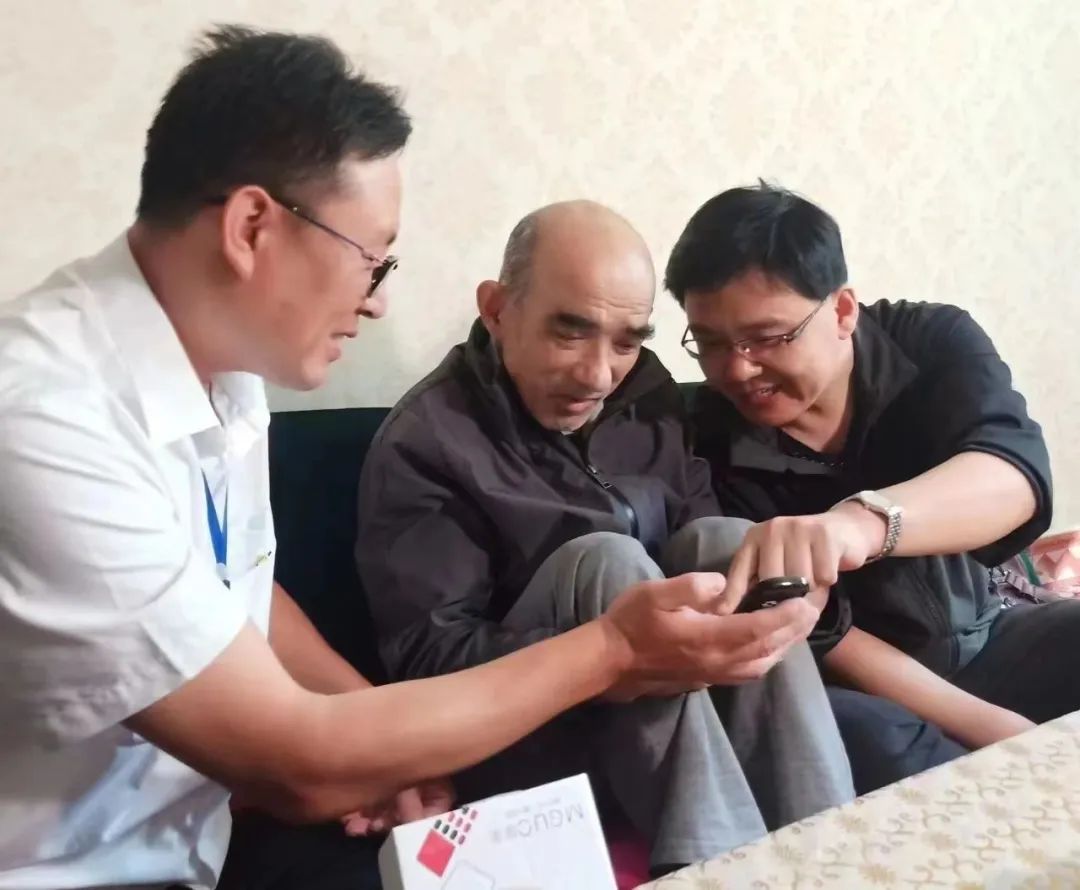 李光明手把手教會(huì)艾合買提使用手機(jī),艾合買提拿著手機(jī)高興得像個(gè)孩子。