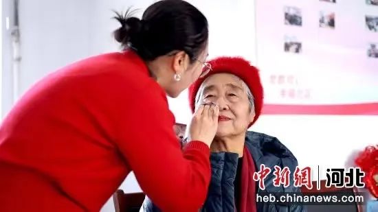 81歲的徐丙志和80歲的趙金鳳是現(xiàn)場年齡最大的老人,他們共同歷經(jīng)了61年的風雨。看著老伴涂抹口紅的樣子,徐丙志老人十分開心。兩個人偎依在一起,幸福地拍照留念。