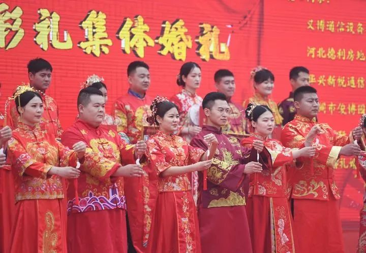 大紅的喜字、鮮艷的綢緞、芬芳的鮮花……2022年5月20日,被裝點得喜氣洋洋的河間市大莊村紅色禮堂內(nèi),正在舉行一場零彩禮集體婚禮。來自興村鎮(zhèn)北李子口村的一對新人——明亮、趙聰敏,身穿中式喜服,和其他6對新人一起,在鄉(xiāng)親們的祝福下掀蓋頭、拜天地、行結(jié)發(fā)禮。