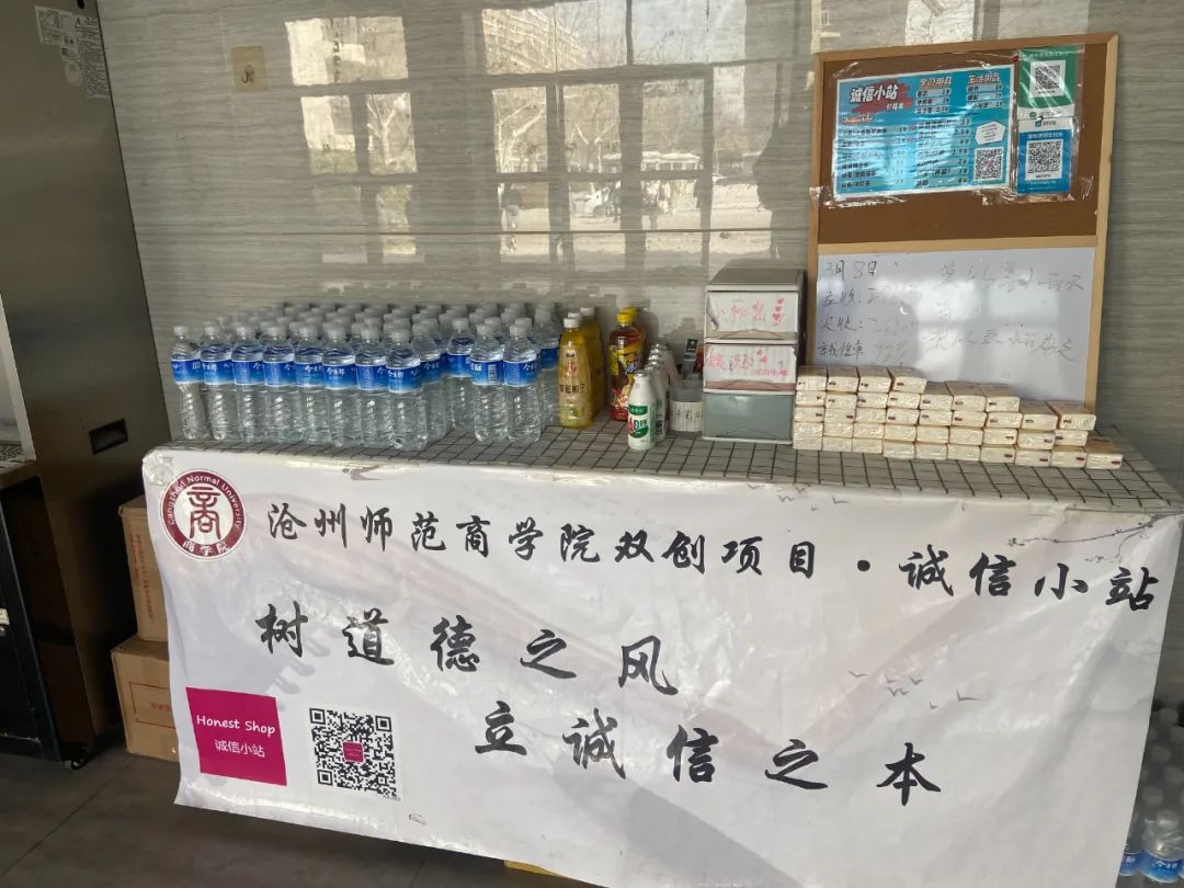 筆、筆芯、紙巾、水、飲料……整齊地擺放在滄州師范學(xué)院文科樓、理科樓門口一張桌子上,墻面上貼著一張價目表,清楚地標(biāo)明每種商品的價格。價目表的旁邊貼著收款的二維碼,沒有收銀員,學(xué)生們拿了商品全靠自覺付現(xiàn)金或微信掃碼支付。這就是誠信小站。