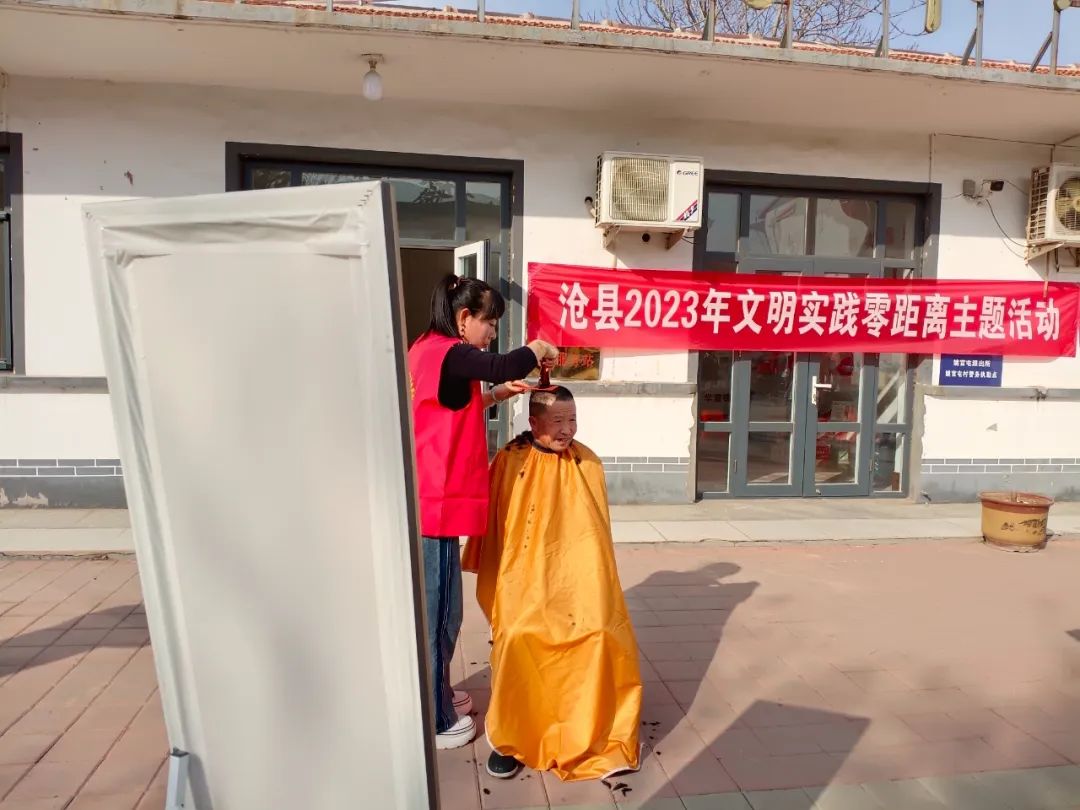 活動(dòng)現(xiàn)場(chǎng),醫(yī)務(wù)志愿者為姚官屯村民測(cè)量血壓、提供健康咨詢服務(wù),對(duì)于腿腳不便的老人,志愿者提供上門服務(wù);滄縣民政局的志愿者們?yōu)榭粘怖先怂腿ノ繂柶?,幫助他們打掃衛(wèi)生,提供力所能及的幫助;會(huì)理發(fā)的志愿者為60周歲以上老人免費(fèi)理發(fā),獲得群眾一致好評(píng)。