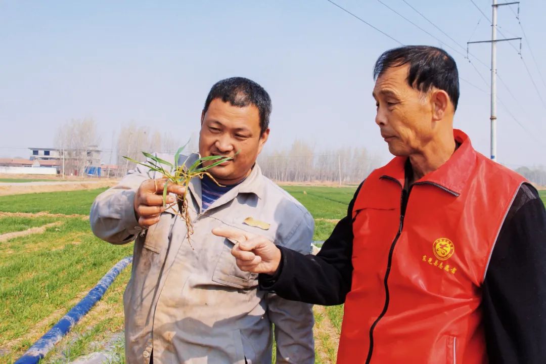▲志愿者指導(dǎo)農(nóng)戶小麥春管技術(shù)。
