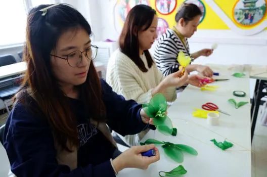 ▲社區(qū)居民學(xué)習(xí)制作網(wǎng)紗花