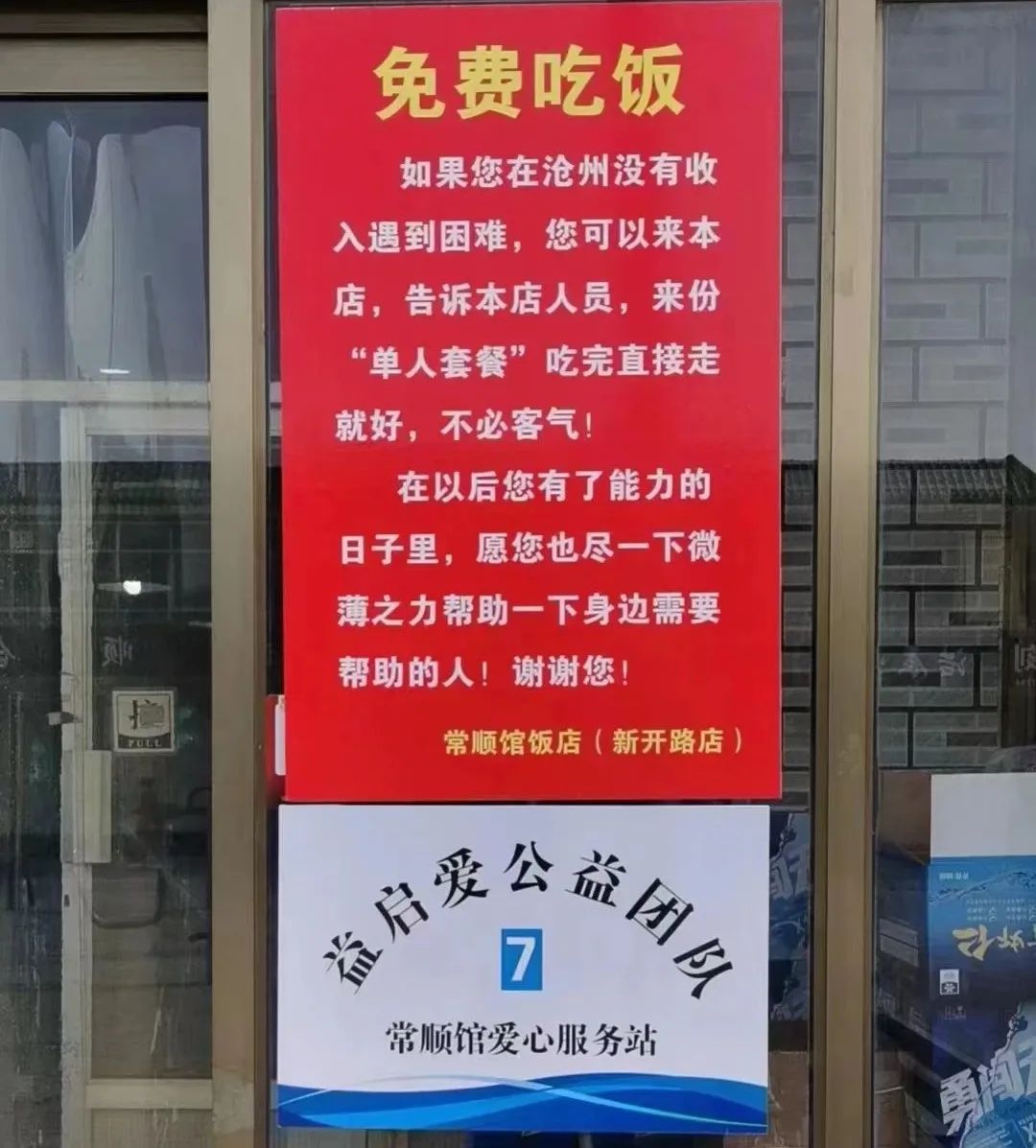 日前,在滄州市新華區(qū)民族路一家飯店門前,張貼了一張暖心通知:有需要的人可以免費(fèi)在店里吃飯。這引起了很多人關(guān)注。大家紛紛為店主的行為點(diǎn)贊。