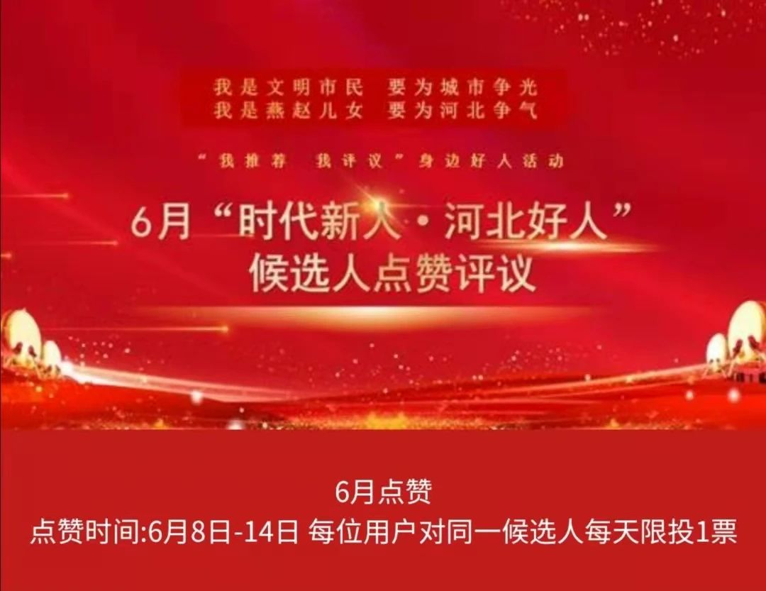 從6月8日起,6月“時(shí)代新人·河北好人”候選人點(diǎn)贊評(píng)議網(wǎng)絡(luò)互動(dòng)活動(dòng)啟動(dòng),歡迎廣大網(wǎng)友為月度“河北好人”候選人點(diǎn)贊并留言。其中,滄州候選人為:敬業(yè)奉獻(xiàn):郭艷汝、李愛(ài)芹;孝老愛(ài)親:姚思穎。