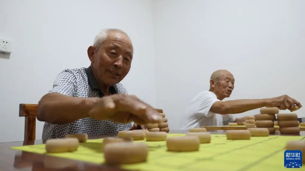 8月22日,老人在青縣曹寺鎮(zhèn)曹寺村的孝老食堂與志愿者下象棋。