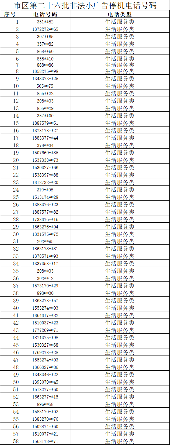 推進(jìn)非法小廣告常態(tài)化治理,我市持續(xù)發(fā)力。今天,市區(qū)第二十六批共58部電話號(hào)碼被強(qiáng)制停機(jī)。截至目前,被停機(jī)的非法小廣告電話號(hào)碼達(dá)到1894部。其中,對(duì)生活服務(wù)類非法小廣告電話號(hào)碼實(shí)行臨時(shí)停機(jī)處理,待機(jī)主接受相應(yīng)的行政處罰后,由相關(guān)責(zé)任單位進(jìn)行復(fù)機(jī)。對(duì)涉嫌制販假證、假票據(jù)、涉黃涉黑等非法小廣告,由公安機(jī)關(guān)調(diào)查確認(rèn),進(jìn)行永久停機(jī)處理。