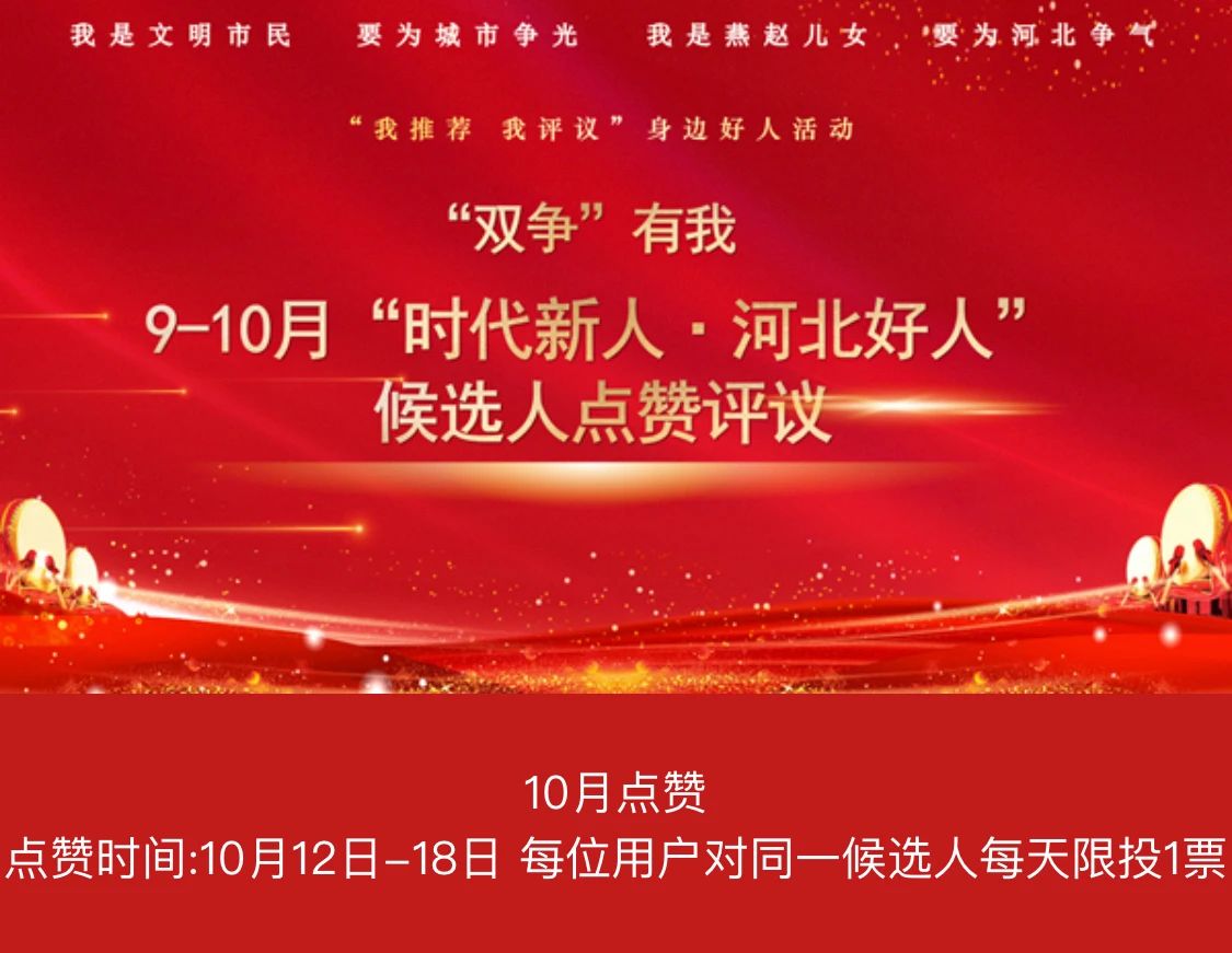 從10月12日起,“雙爭”有我——9—10月“時代新人·河北好人”候選人點贊評議網(wǎng)絡(luò)互動活動啟動,歡迎廣大網(wǎng)友為月度“河北好人”候選人點贊并留言。其中,滄州候選人為:助人為樂:張杰、鄭季蓮;見義勇為:劉占民;孝老愛親:張立寒、盧朝霞。