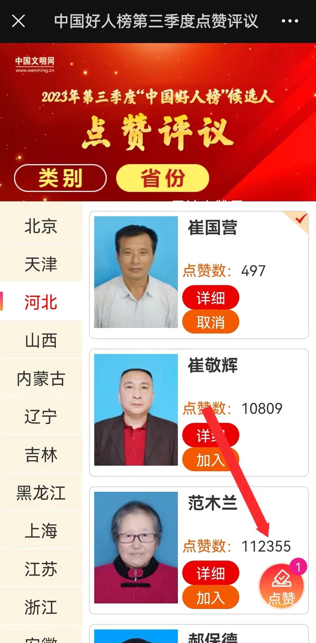 金風(fēng)送爽丹桂飄香,又到秋高氣爽好時(shí)節(jié)。即日起,經(jīng)過(guò)基層干部群眾舉薦、各地文明辦和相關(guān)單位審核推薦的279名2023年第三季度“中國(guó)好人榜”候選人將通過(guò)中國(guó)文明網(wǎng)進(jìn)行事跡展示,接受網(wǎng)友的點(diǎn)贊評(píng)議。此為中央精神文明建設(shè)辦公室網(wǎng)上“我推薦我評(píng)議身邊好人”活動(dòng)的環(huán)節(jié)之一,將持續(xù)至2023年10月24日。河北共有9人(組)被推選為第三季度“中國(guó)好人榜”候選人。其中,我市崔國(guó)營(yíng)榜上有名。