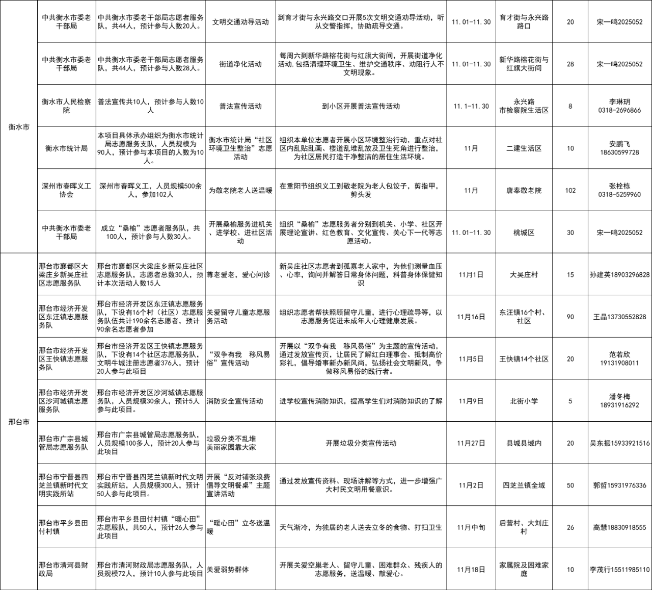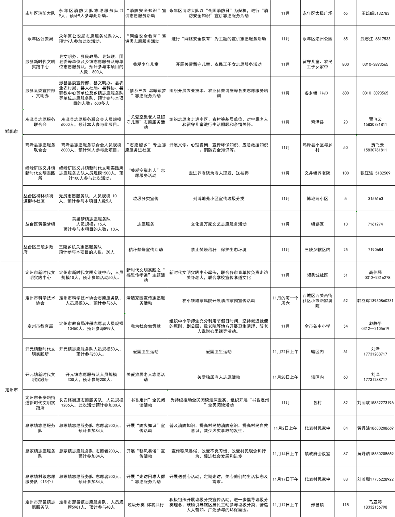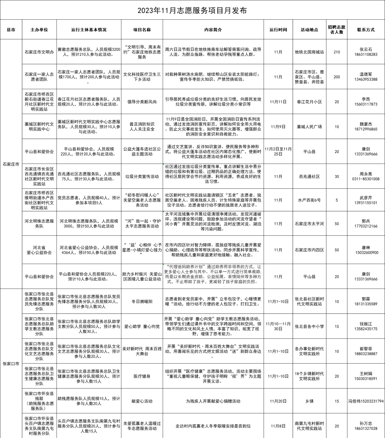 2023年11月,河北各地、省直有關(guān)單位計(jì)劃開展的志愿服務(wù)項(xiàng)目共計(jì)1722個(gè),我們從中選取了115個(gè)具有典型意義的志愿服務(wù)項(xiàng)目進(jìn)行集中發(fā)布。