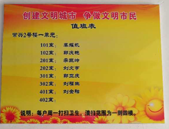 日前,記者隨同網(wǎng)格員一同來到常興樓小區(qū),看到小區(qū)兩幢樓的每個單元口,都張貼著一張值班表,有幾位居民正在樓梯間和單元門前打掃衛(wèi)生。據(jù)介紹,“值班表”推廣幾個星期以來,小區(qū)衛(wèi)生環(huán)境得到了明顯改善。