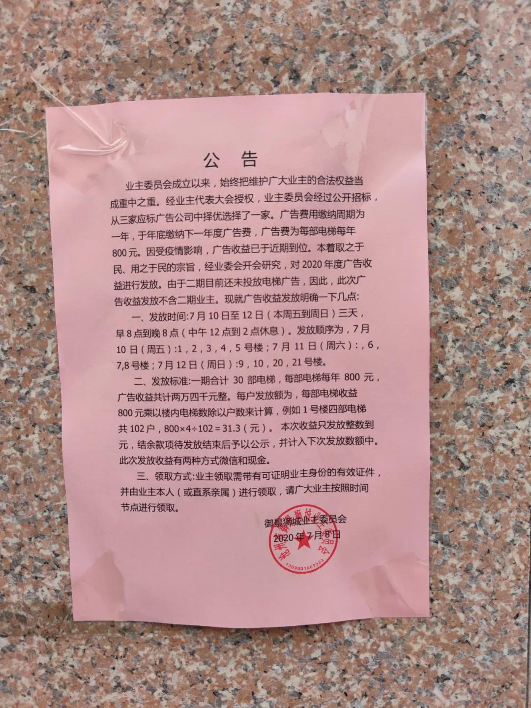 “曾有居民詢問過,這筆電梯廣告收入歸誰。我告訴他們,小區(qū)的公共收益歸業(yè)主所有?!毙^(qū)業(yè)主委員會(huì)主任孫國(guó)勝告訴記者,這筆廣告收入近期已經(jīng)到位。本著“取之于民,用之于民”的宗旨,業(yè)主委員會(huì)開會(huì)研究后決定,利用7月10日至7月12日3天時(shí)間,向小區(qū)一期的業(yè)主發(fā)放這筆廣告收益。由于小區(qū)二期居民樓的電梯內(nèi)沒有懸掛廣告,此次廣告收益發(fā)放對(duì)象不包括小區(qū)二期的業(yè)主。
