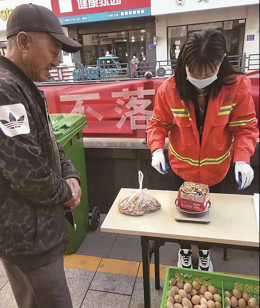 雞蛋、純凈水、花露水、洗發(fā)水……根據(jù)撿拾的煙頭量大小,市民可以兌換不同的物品。在運(yùn)河區(qū)小南門商業(yè)街頤和商城南門兌換點(diǎn),有的市民拎著一塑料袋煙頭,有的拿著紙包裹著十幾個煙頭,笑呵呵地來換禮品。