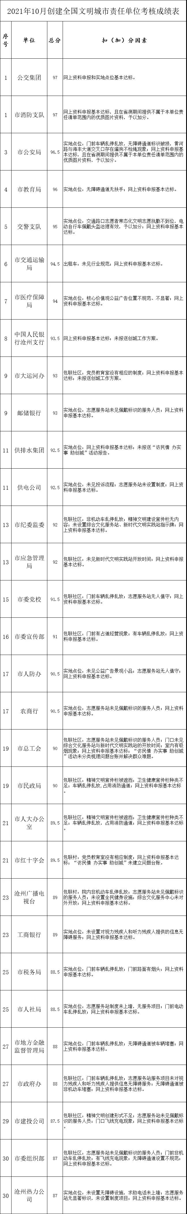 為發(fā)揮考核的評價、導(dǎo)向和激勵作用,確保我市全國文明城市創(chuàng)建工作有序開展,根據(jù)全國文明城市創(chuàng)建暨城市品質(zhì)形象提升推進(jìn)會議精神,自2021年10月起,對市直、駐滄創(chuàng)城責(zé)任單位考核周期由每季度調(diào)整為每月。市創(chuàng)城辦對全市89個責(zé)任單位10月的創(chuàng)建任務(wù)落實情況進(jìn)行了考核。