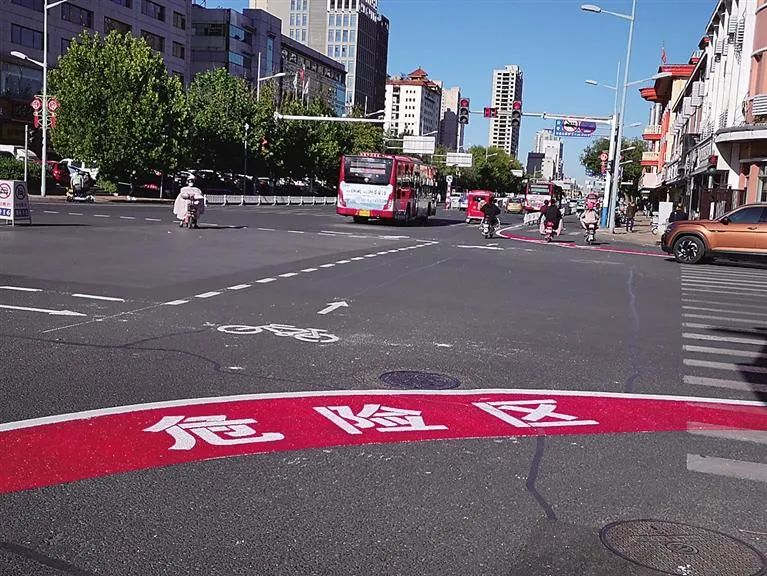 此外,市區(qū)解放西路和永安南大道交叉口、清池南大道和黃河?xùn)|路交叉口等多個路口也施劃了右轉(zhuǎn)“危險區(qū)”等。