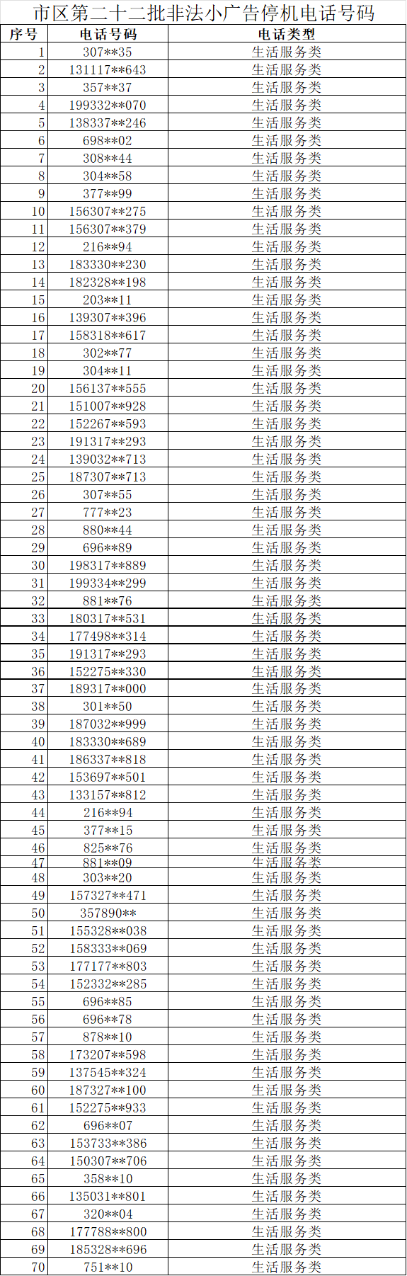 推進(jìn)非法小廣告常態(tài)化治理,我市持續(xù)發(fā)力。記者從我市小廣告專項整治行動領(lǐng)導(dǎo)小組辦公室獲悉,今天,市區(qū)第二十二批共70部電話號碼被強制停機。截至目前,被停機的非法小廣告電話號碼達(dá)到1659部。其中,對生活服務(wù)類非法小廣告電話號碼實行臨時停機處理,待機主接受相應(yīng)的行政處罰后,由相關(guān)責(zé)任單位進(jìn)行復(fù)機。對涉嫌制販假證、假票據(jù)、涉黃涉黑等非法小廣告,由公安機關(guān)調(diào)查確認(rèn),進(jìn)行永久停機處理。