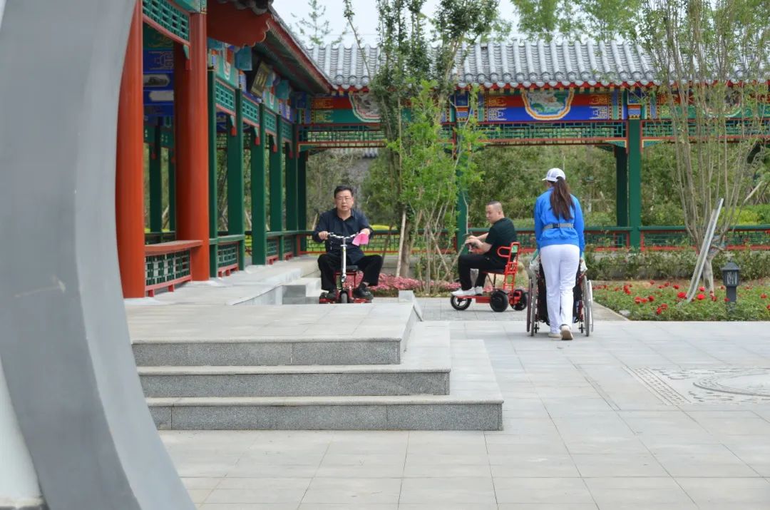 在河北省第六屆(滄州)園林博覽會會場—滄州園博園,肢殘朋友乘坐輪椅和助行器在觀賞園林景色的同時體驗了無障礙坡道、無障礙衛(wèi)生間。