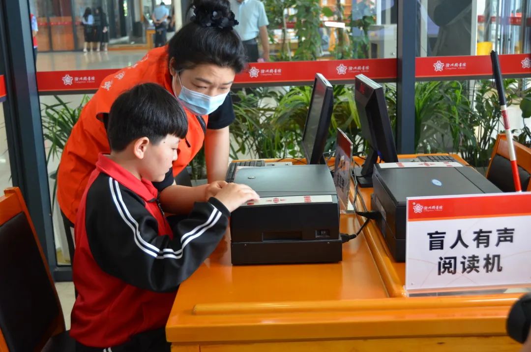 在滄州市圖書館,視障兒童在志愿者的幫助下走進盲人閱覽室,體驗了電子助視器、盲人有聲閱讀機和盲人電影等方便視障人士使用的無障礙設施。