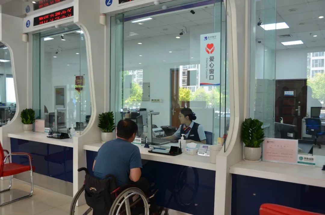 在滄州銀行迎賓支行,肢殘朋友在志愿者的幫助下通過無障礙通道進入營業(yè)廳,在低位服務臺體驗業(yè)務辦理流程。