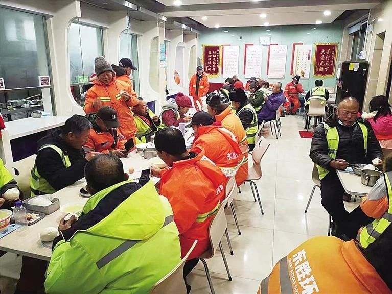 ▲環(huán)衛(wèi)工人再愛心粥屋內(nèi)就餐